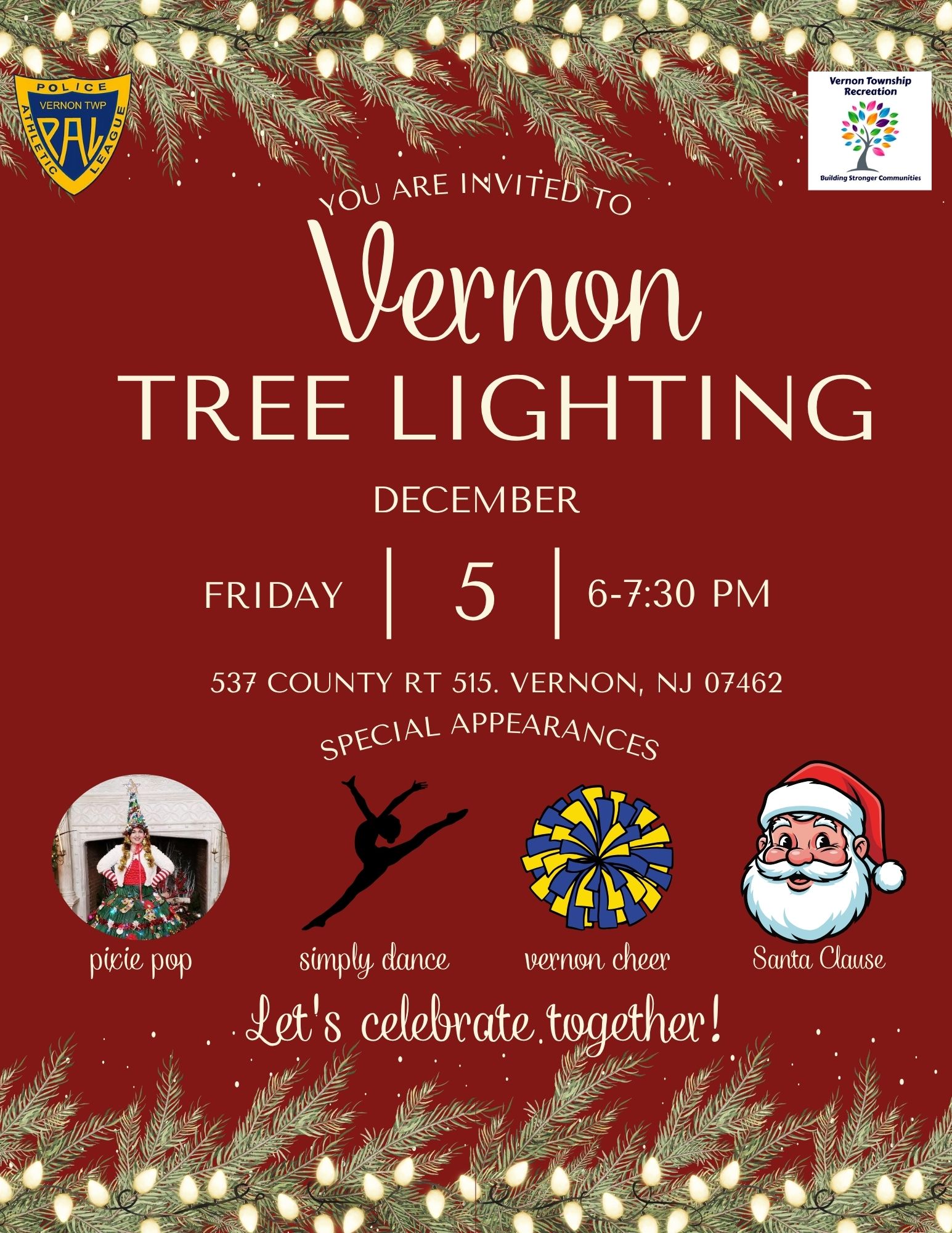 Kick off the holiday season at Vernon Township's Community Tree Lighting on Friday December 5, 2025 from 6-7:30 pm hosted by the Vernon Police Athletic League! 🎄🌟 Bring your family and friends for a festive evening of joy, cheer, and community spirit