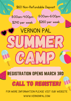Looking for an exciting and fun-filled summer experience for your child? Register them today for the Vernon PAL Summer Camp! Our camp runs for the first 8 weeks of summer, starting the week after the school year ends. We offer two convenient time slots: 8:00 AM - 4:00 PM and 8:00AM - 6:00 PM, Monday through Friday. Registration OPENS March 3rd!